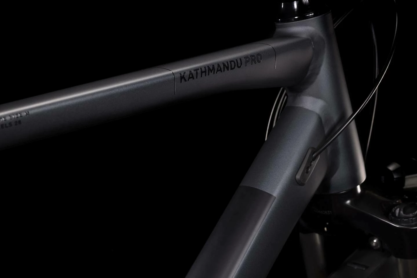 Das Kathmandu Pro haben wir für die Saison 2022 komplett überarbeitet – es hat alles, was man braucht, und kommt ohne unötigen Schnickschnack aus. Mit dabei sind der überarbeitete integrierte Gepäckträger, extralange Schutzbleche, Vorder- und Rücklichter und der CUBE FM Seitenständer. Das Bike ist damit nicht nur der optimale Begleiter für den Alltag; es stellt dank seiner robusten Konstruktion auch auf langen Strecken seine Klasse unter Beweis. Komfortabel: Die Suntour Luftfedergabel schluckt sämtliche Schläge von Buckeln oder Schlaglöchern auf der Strecke weg wie nichts. Und die breit gefächerte, superzuverlässige Shimano 3×10-fach Schaltung macht jede Route zum Genuss. Dazu passende hydraulische Shimano Scheibenbremsen verzögern das Bike sicher und souverän, und zwar bei jedem Wetter. Ob Großstadtdschungel oder Outback – das Kathmandu Pro macht alles mit!