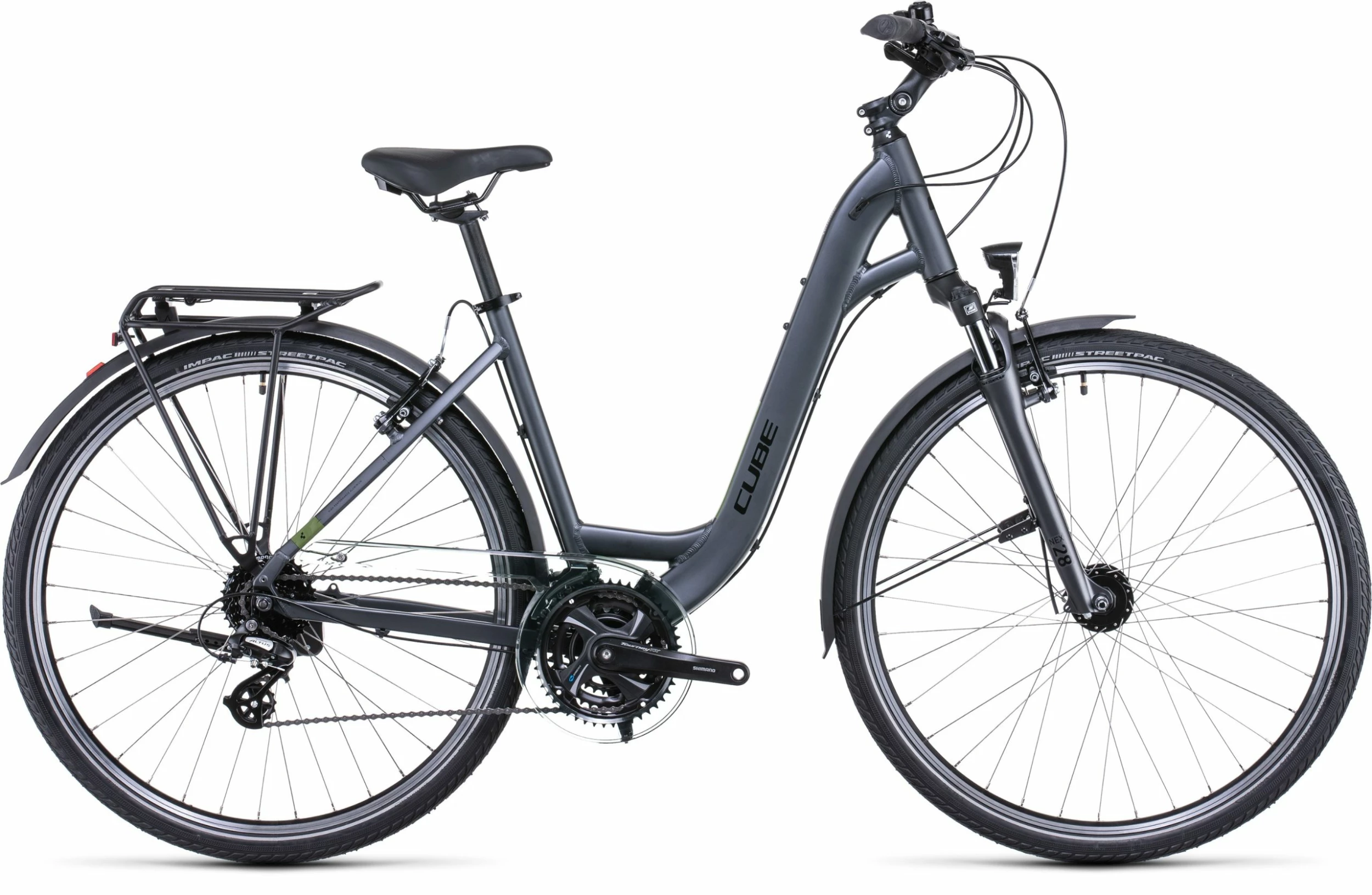Egal, wohin die Reise geht – das CUBE Touring erfüllt sämtliche Ansprüche in Sachen Fahrkomfort, Vielseitigkeit, Sicherheit und Fahrspaß mit links. Dank unserer bewährten Efficient Comfort Geometry und der geschmeidig arbeitenden Suntour Federgabel lässt sich dieses Bike selbst von den löchrigsten Schotterwegen nicht beeindrucken. Wir haben außerdem jede Menge praktisches Zubehör verbaut, zum Beispiel einen ästhetisch integrierten Gepäckträger, lange Schutzbleche, eine dynamobetriebene Lichtanlage und einen Seitenständer. Damit ist man für alle Eventualitäten optimal gerüstet. Und das Gängewechseln geht dank der 3×8-Schaltung von Shimano ebenso einfach wie das sichere Bremsen mit den leichten, aber kraftvoll zupackenden Felgenbremsen. Selbstverständlich hat das Rad unsere strengen hauseigenen Sicherheits- und Härtetests mit Bravour bestanden.