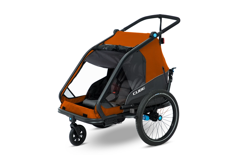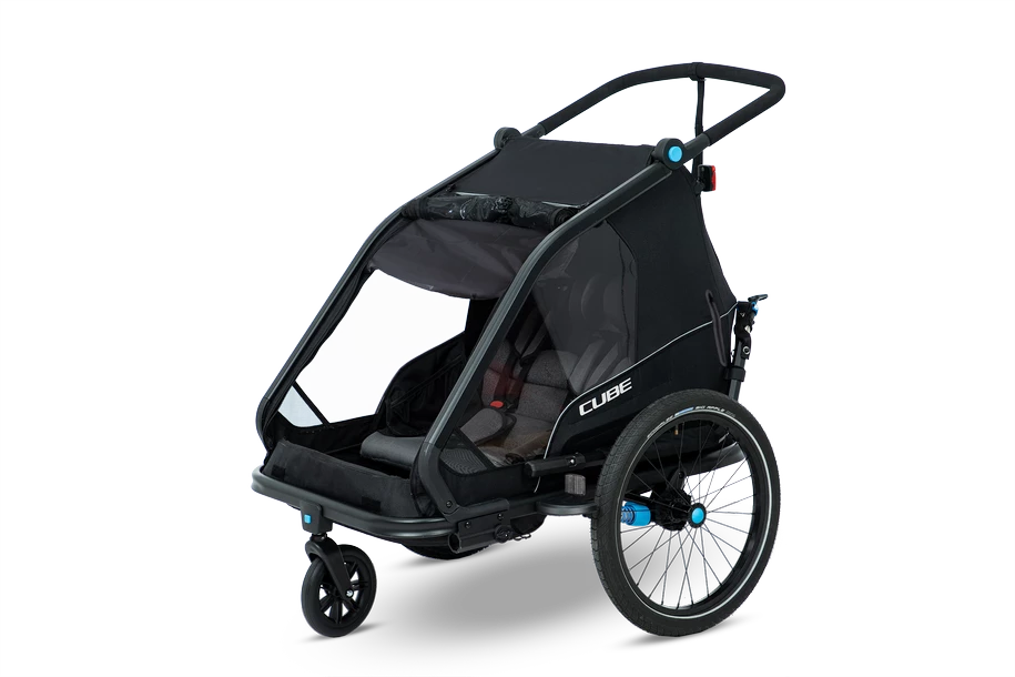 Der CUBE Fahrradanhänger Double CMPT ist der optimale Begleiter durch den Alltag. Das Multitalent besticht durch ausgeklügelte Funktionen als Fahrrad-Anhänger und Kinderwagen. Der große Insektenschutz an der Front und den Seiten hält ungewollte Fahrgäste vor dem Eindringen ab, ohne dabei die Frischluftzirkulation zu beeinflussen. Dank Sonnenschutz werden die kleinen Fahrgäste nicht bei ihren Nickerchen geblendet. Der Spritzschutz hält die Kids auch bei matschigen Fahrten trocken. Die Sitz- und Rückenpolster sowie Kopfpolster mit Helmpocket, machen die Fahrt für die Kleinen zum komfortablen Vergnügen. Die Federung ist individuell einstellbar, je nach Untergrund und Gewicht. Mit dem zusätzlich erhältlichen Jogger Kit lassen sich alle Ausflüge noch flexibler gestalten.