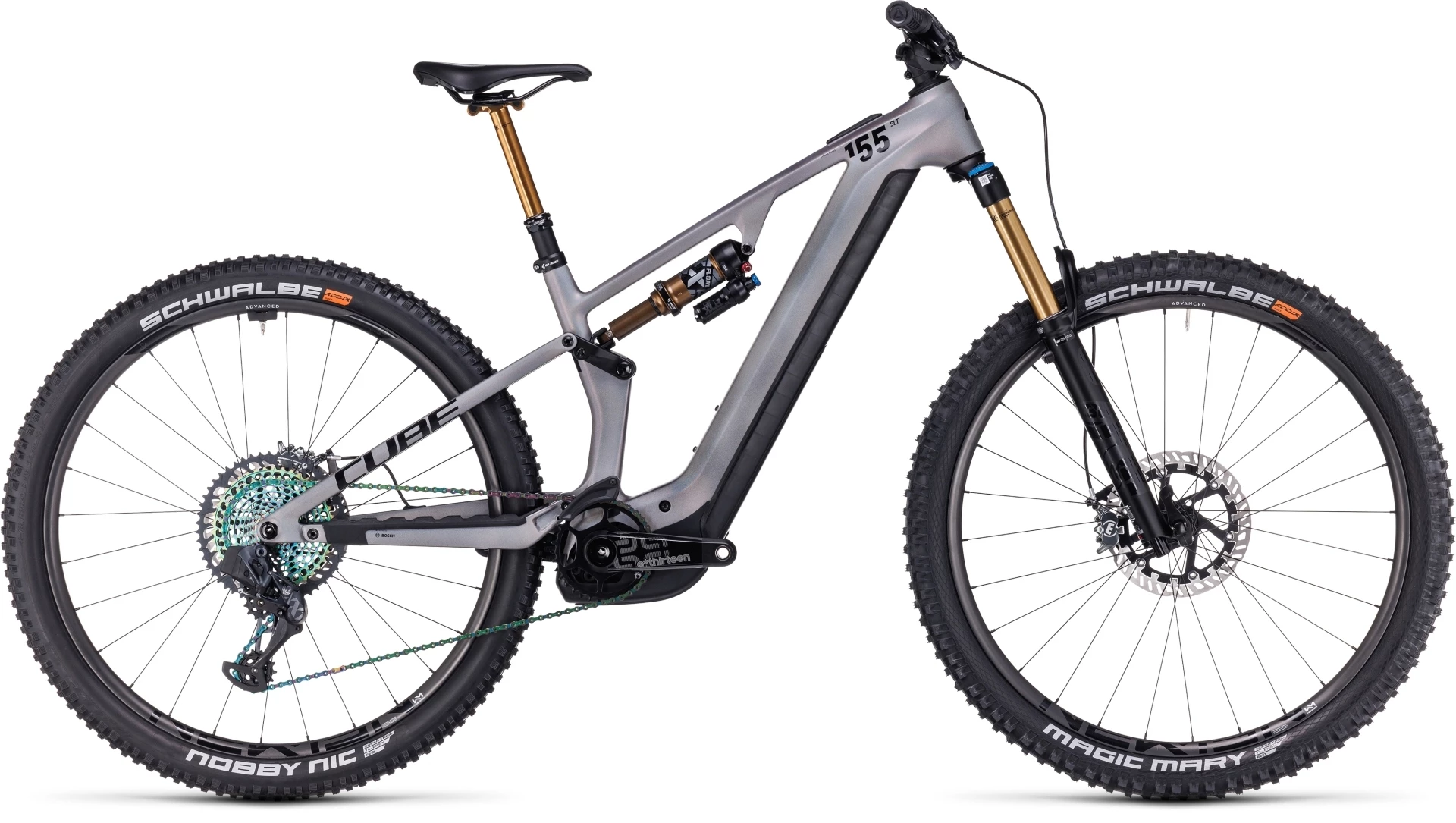 Wenn’s um ultimativen All-Mountain-Fahrspaß geht, eröffnet dir dieses Bike neue Horizonte. Sein Name: Stereo Hybrid ONE55 C:68X SLT 750 29, sein Auftritt: revolutionär! Es kommt mit unserem bisher leichtester intube Carbonrahmen für E-Fullys auf die Trails, dazu mit einer Geometrie, wie sie progressiver nicht sein könnte. Das Ergebnis zeigt sich in gnadenloser Trail-Performance im Gelände, bergauf wie bergab. Dabei arbeitet die elektronische Eagle AXS XX1 12-fach Schaltung von Sram harmonisch mit dem Bosch CX Motor der vierten Generation (mit 750 Wh starkem Akku) zusammen – für perfekt dosierten Vortrieb, viel Reichweite und saubere, geschmeidige Schaltvorgänge, den ganzen (Trail-)Tag lang. Bei so einem potenten Set-up dürfen natürlich auch die Newmen Advanced Laufräder nicht fehlen, auf die wir Schwalbe Magic Mary und 2.4 Zoll Nobby Nic Reifen aufgezogen haben. Kraftvolle Bremsmanöver gehen auf das Konto der leistungsstarken hydraulischen MT7 Scheibenbremsen von Magura mit großen Rotoren. Und weil wir eine Fox 36 Factory Grip2 Federgabel samt passendem Float X Factory Dämpfer und eine versenkbare Sattelstütze verbaut haben, behältst du bergab immer die volle Kontrolle, selbst in extrem ruppigen Gelände.