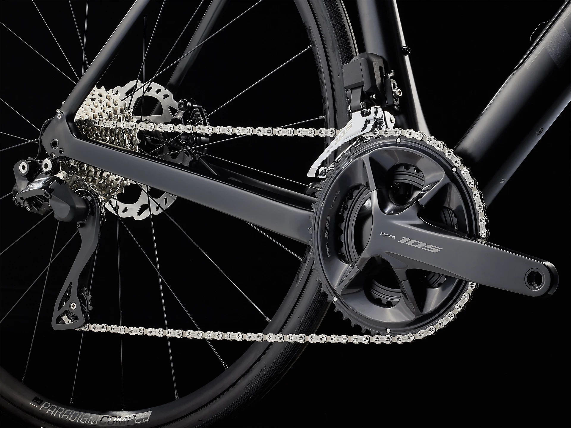 Einen Rahmen aus 500 Series OCLV Carbon mit vibrationsdämpfendem hinterem IsoSpeed, kraftvoll zupackende Flat Mount-Scheibenbremsen und eine Shimano 105 Di2 Komplettgruppe mit 2×11-Antrieb. Dazu gibt es Bontragers Paradigm Comp Tubeless Ready-Laufräder und einen Bontrager Elite IsoZone-Lenker zur Verringerung von Ermüdungserscheinungen sowie ein integriertes Staufach und innen verlegte Züge für mehr Leistung bei schlankerem Look.
