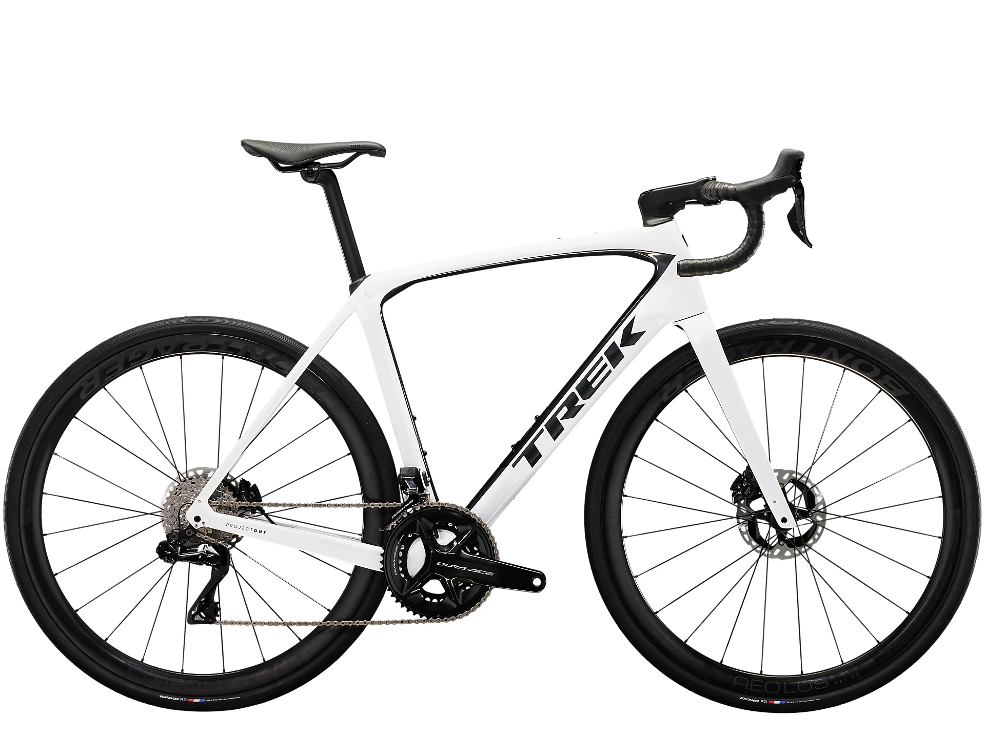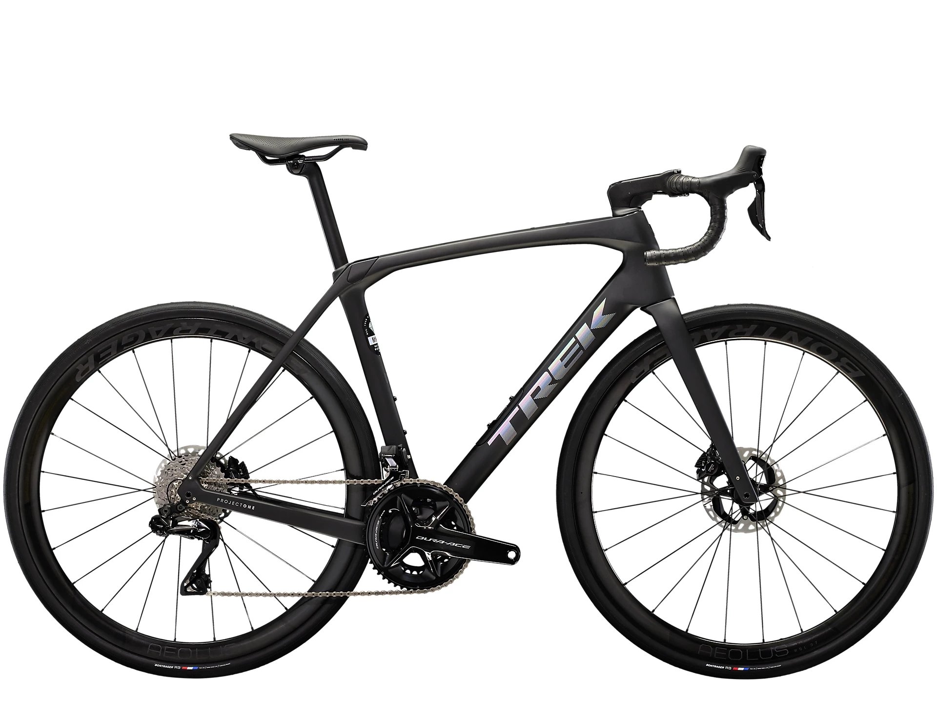 Einen Rahmen samt Gabel aus 800 Series OCLV Carbon mit hinterem IsoSpeed, integriertem internem Staufach und Befestigungsmöglichkeiten am Oberrohr. Ausgestattet ist es mit Shimanos drahtlosem, elektronischem Dura-Ace Di2 2×12-Antrieb, kraftvoll zupackenden Flat Mount-Scheibenbremsen, Aeolus Pro 37-Carbonlaufrädern und einem Bontrager Pro IsoCore-Lenker, der Straßenvibrationen im Vergleich zu herkömmlichen Carbonlenkern um 20 % verringert.