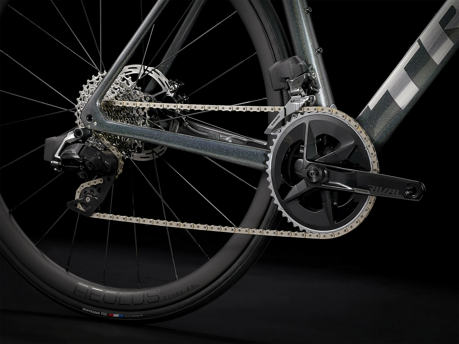 Einen leichten und aerodynamischen Rahmen samt Gabel aus 500 Series OCLV Carbon, einen drahtlosen elektronischen SRAM Rival eTap AXS 2×12-Antrieb, einen Rival AXS-Powermeter und Aeolus Elite 35 Tubeless Ready-Carbonlaufräder.